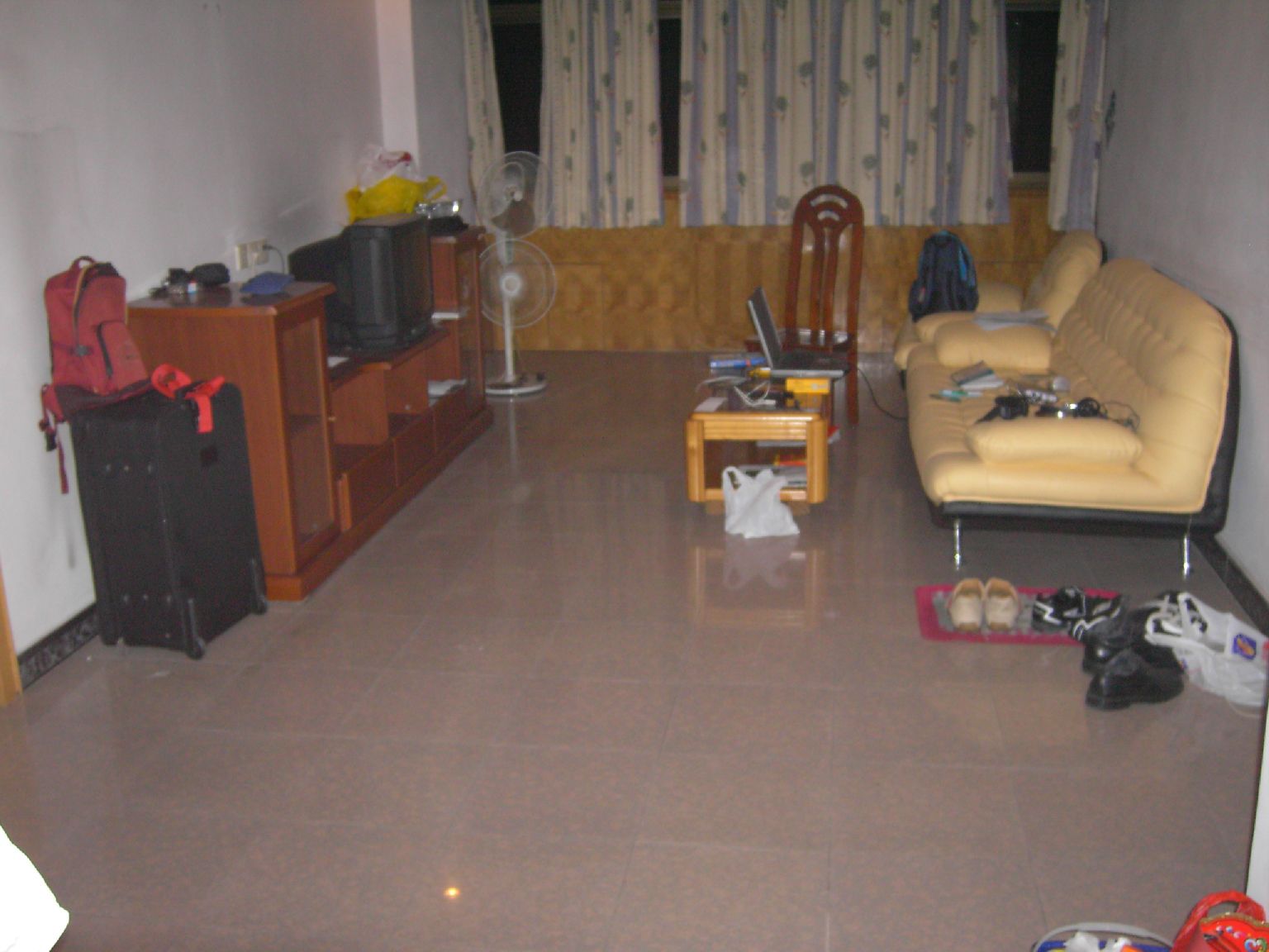 | Das Wohnzimmer mit Fernseher - aber der ist anscheinend kaputt, denn von dem Programm versteht man kein Wort ;-)